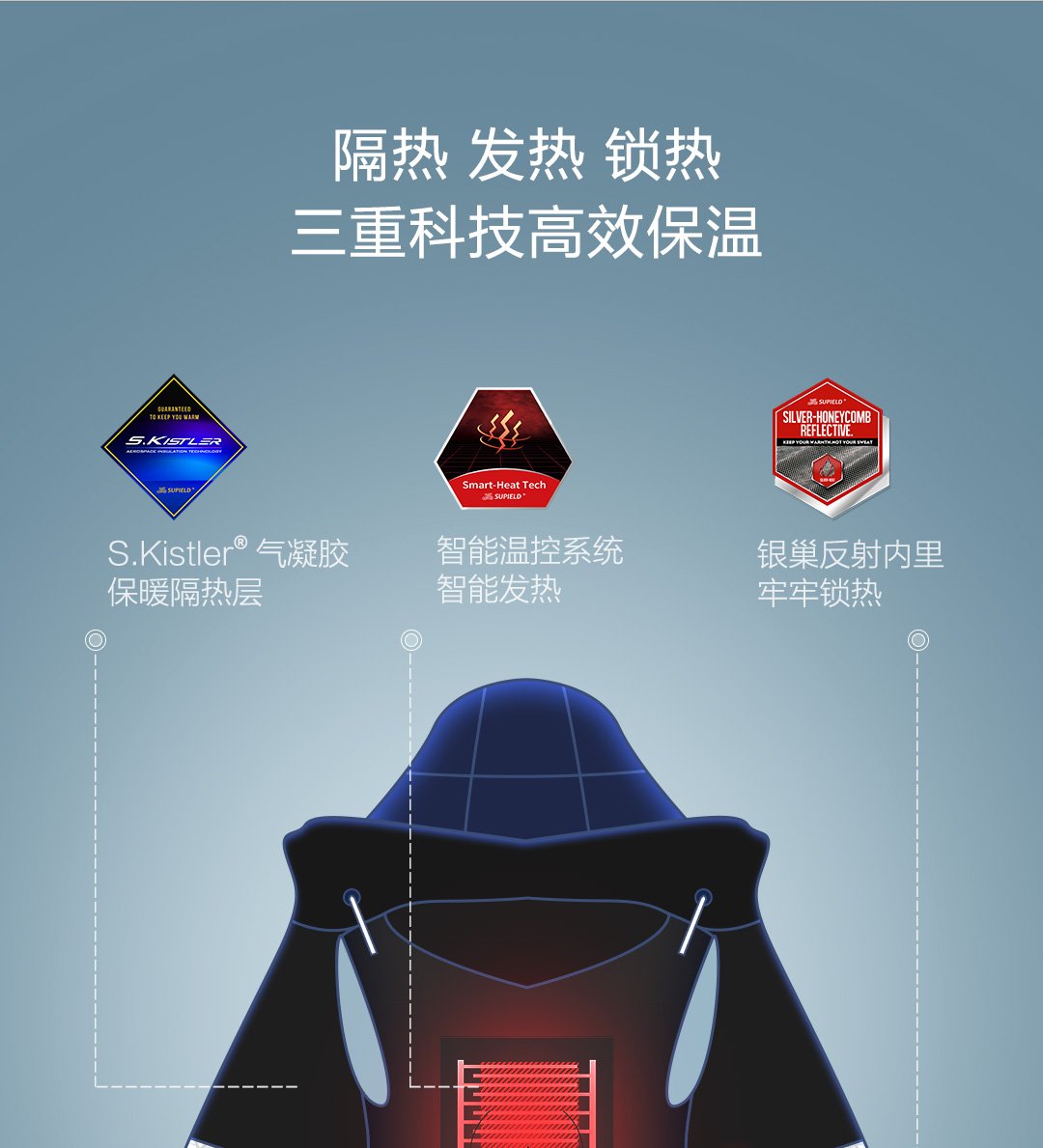 Supai aerogel temperature-controlled heating cold-resistant clothes adopts nano-grade carbon fibre heating wire, and the entire clothes could be washed straight with no danger of leakage or brief circuit.